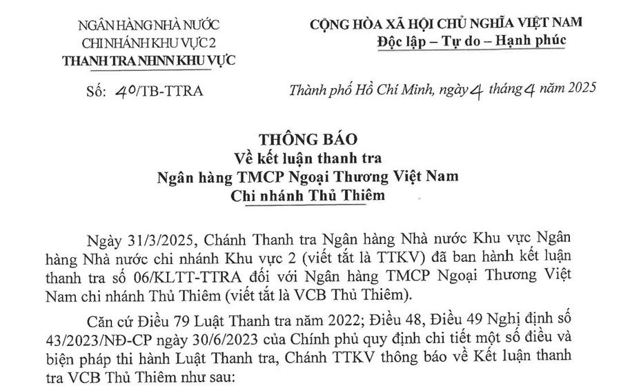Ngày 04/04, Thanh tra Ngân hàng Nhà nước (NHNN) Khu vực - NHNN Chi nhánh Khu vực 2 đã có thông báo về Kết luận thanh tra đối với Ngân hàng TMCP Ngoại thương Việt Nam Chi nhánh Thủ Thiêm (VCB Thủ Thiêm).