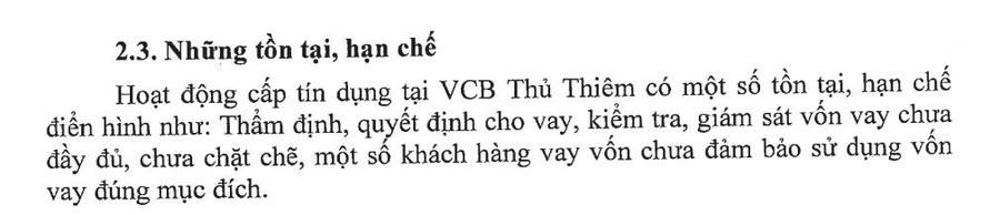 Tuy nhiên, trong hoạt động cấp tín dụng tại VCB Thủ Thiêm, Thanh tra NHNN Khu vực phát hiện một số tồn tại, hạn chế điển hình như: Thẩm định, quyết định cho vay, kiểm tra, giám sát vốn vay chưa đầy đủ, chưa chặt chẽ, một số khách hàng vay vốn chưa đảm bảo sử dụng vốn đúng mục đích.