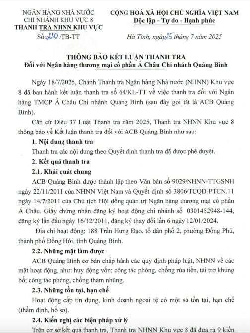 Chánh Thanh tra Ngân hàng Nhà nước khu vực 8 vừa ban hành kết luận thanh tra ngày 25/7/2025 đối với Ngân hàng Thương mại Cổ phần Á Châu (ACB), chi nhánh Quảng Bình.