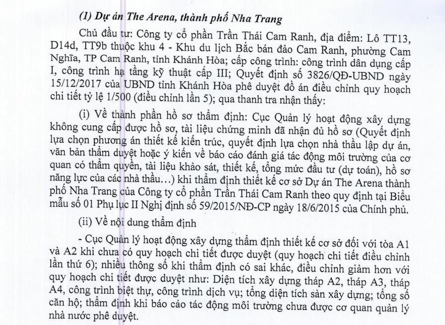 Theo kết luận, trong quá trình thẩm định thiết kế cơ sở dự án The Arena, Cục Quản lý hoạt động xây dựng không cung cấp được hồ sơ, tài liệu chứng minh đã nhận đủ hồ sơ khi thẩm định thiết kế cơ sở dự án của CTCP Trần Thái Cam Ranh.