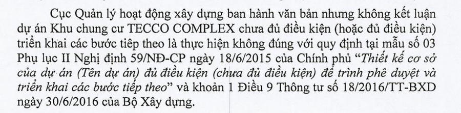 Qua thanh tra nhận thấy, Cục Quản lý hoạt động xây dựng ban hành văn bản nhưng không kết luận dự án Chung cư Tecco Complex chưa đủ điều kiện (hoặc đủ điều kiện) triển khai các bước tiếp theo là thực hiện không đúng với quy định tại mẫu số 03 Phụ lục II Nghị định 59/NĐ-CP ngày 18/6/2015 của Chính phủ "Thiết kế cơ sở của dự án (Tên dự án) đủ điều kiện (chưa đủ điều kiện) để trình phê duyệt và triển khai các bước tiếp theo" và khoản 1 Điều 9 Thông tư số 18/2016/TT-BXD ngày 30/6/2016 của Bộ Xây dựng.