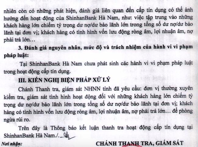 Mặc dù hoạt động cấp tín dụng tại ShinhanBank Hà Nam tuân thủ quy định của Ngân hàng Nhà nước Việt Nam và của ShinhanBank, nhưng thanh tra cũng ghi nhận một số vấn đề cần lưu ý.