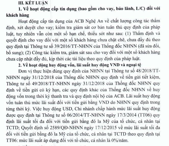 Kết luận thanh tra nêu rõ, hoạt động cấp tín dụng của ACB Nghệ An về chất lượng công tác thẩm định, xét duyệt cho vay; kiểm tra giám sát cơ bản tuân thủ quy định của pháp luật, tuy nhiên, vẫn còn một số hạn chế, thiếu sót.