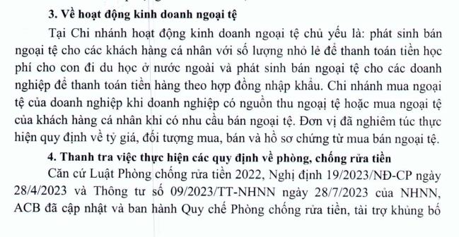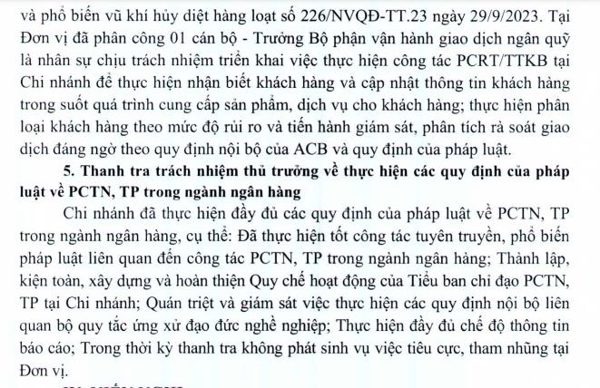Về việc thực hiện các quy định về phòng, chống rửa tiền, đơn vị đã phân công Trưởng Bộ phận vận hành giao dịch ngân quỹ là nhân sự chịu trách nhiệm triển khai việc thực hiện công tác này để thực hiện nhận biết khách hàng và cập nhật thông tin khách hàng trong suốt quá trình cung cấp sản phẩm, dịch vụ cho khách hàng; thực hiện phân loại khách hàng theo mức độ rủi ro và tiến hành giám sát, phân tích rà soát giao dịch đáng ngờ theo quy định nội bộ của ACB và quy định của pháp luật.