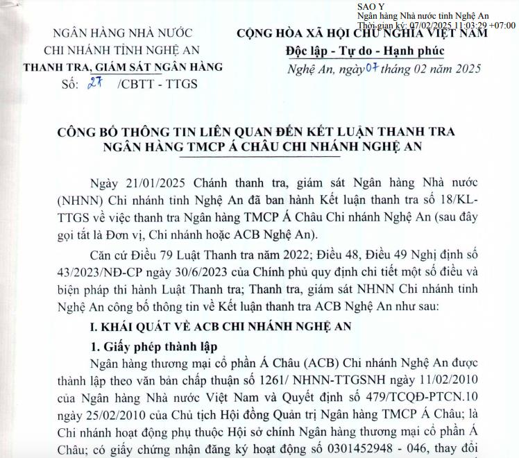 Cơ quan thanh tra cũng yêu cầu ACB chi nhánh Nghệ An thu thập đầy đủ các tài liệu, chứng từ chứng minh mục đích sử dụng vốn, thực hiện trước 31/3/2025.