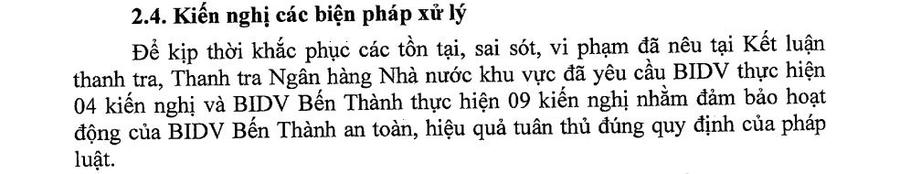 Để kịp thời khắc phục các tồn tại, sai sót, vi phạm đã nêu tại Kết luận thanh tra, Thanh tra NHNN khu vực đã yêu cầu BIDV và BIDV Bến Thành thực hiện một số kiến nghị nhằm đảm bảo hoạt động của BIDV Bến Thành an toàn, hiệu quả tuân thủ đúng quy định của pháp luật.