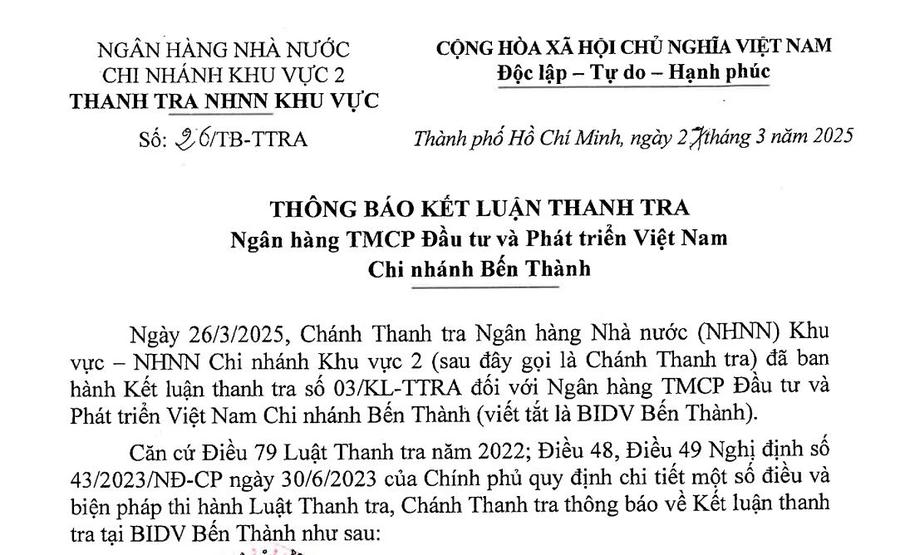 Ngày 26/3/2025, Chánh Thanh tra Ngân hàng Nhà nước (NHNN) Khu vực - NHNN Chi nhánh Khu vực 2 đã ban hành Kết luận thanh tra số 03/KL-TTRA đối với Ngân hàng TMCP Đầu tư và Phát triển Việt Nam Chi nhánh Bến Thành (BIDV Bến Thành).