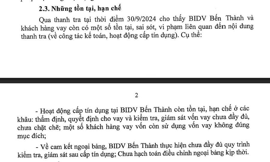 Tuy nhiên, qua thanh tra tại thời điểm 30/9/2024 cho thấy, BIDV Bến Thành và khách hàng vay còn có một số tồn tại, sai sót, vi phạm liên quan đến nội dung thanh tra (về công tác kế toán, hoạt động cấp tín dụng).