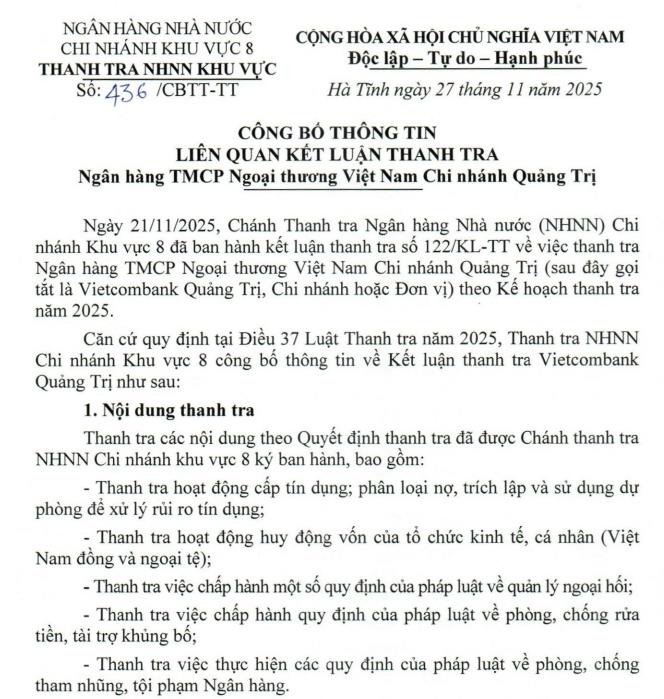 Mới đây, Thanh tra Ngân hàng Nhà nước - Chi nhánh khu vực 8 công bố kết luận thanh tra đối với Ngân hàng TMCP Ngoại Thương Việt Nam - Chi nhánh Quảng Trị (Vietcombank Quảng Trị).