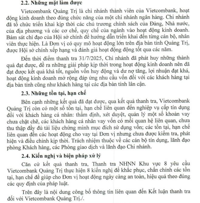 Theo kết luận thanh tra, Vietcombank Quảng Trị thẩm định, xét duyệt, quản lý một số khoản vay chưa chặt chẽ, các khách hàng cá nhân vay vốn có mối quan hệ liên quan, chưa thu thập đầy đủ tài liệu chứng minh mục đích sử dụng vốn; các tồn tại, hạn chế liên quan đến các hoạt động cho vay tại Đơn vị nhưng chưa được kiểm tra, phát hiện và điều chỉnh kịp thời.