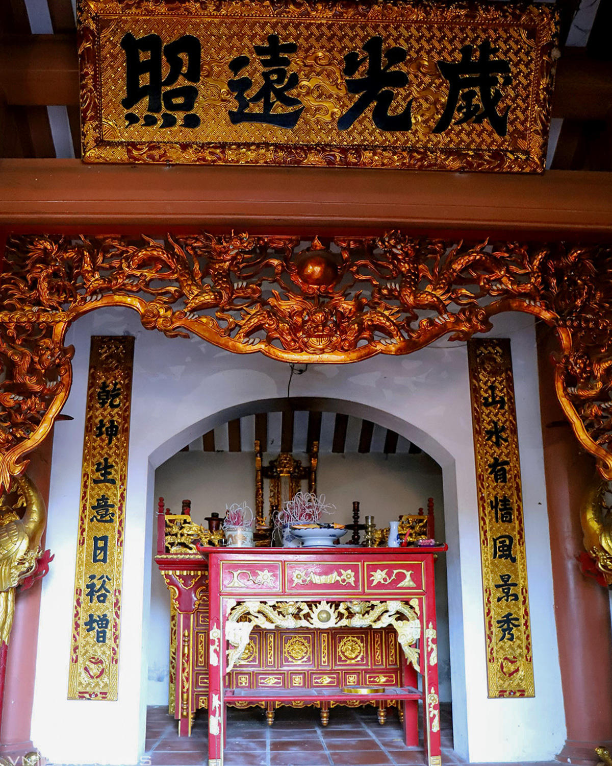 Bên trong điện thờ được bố trí sập thờ và lư hương để người dân và khách thập phương bày tỏ lòng thành kính đối với Lê Am.