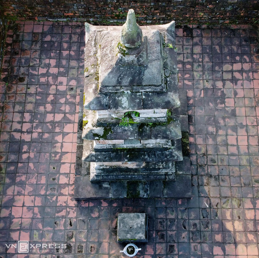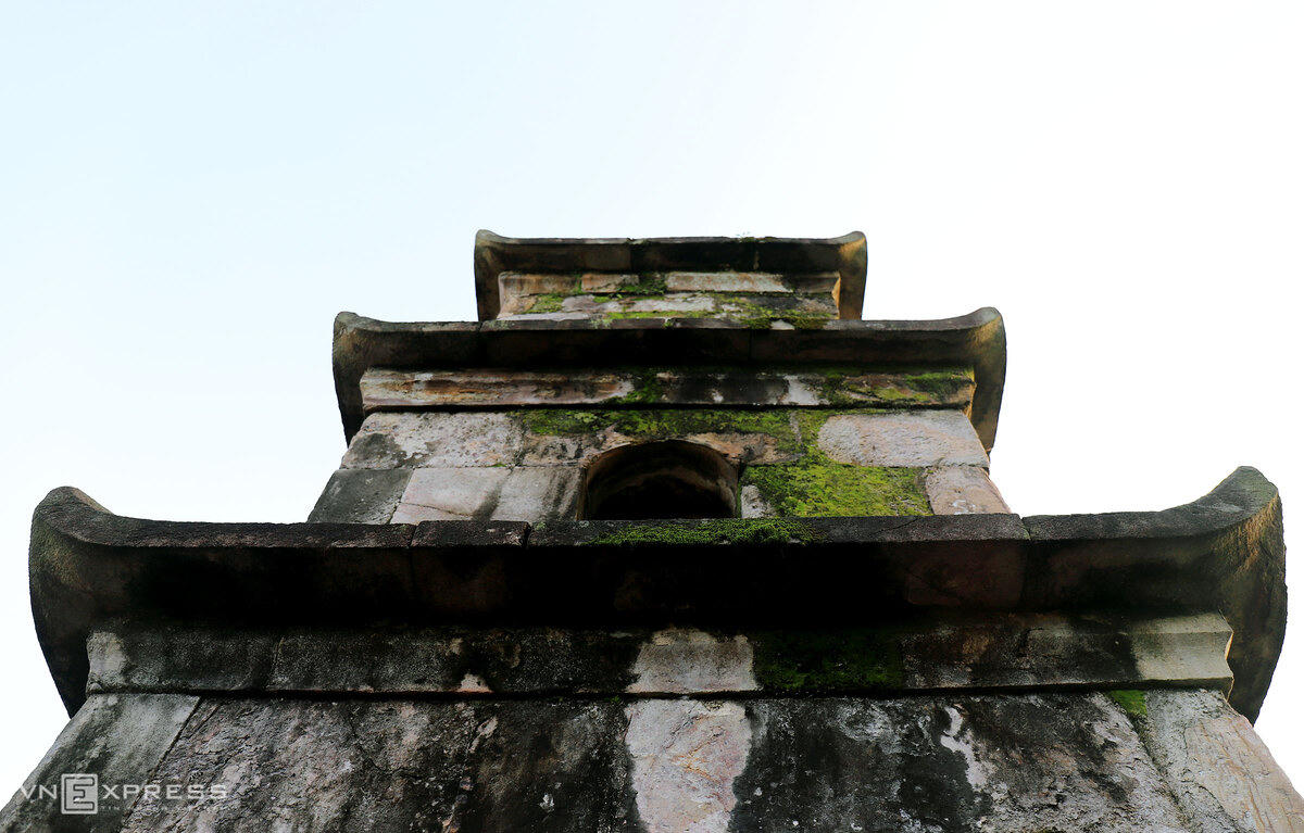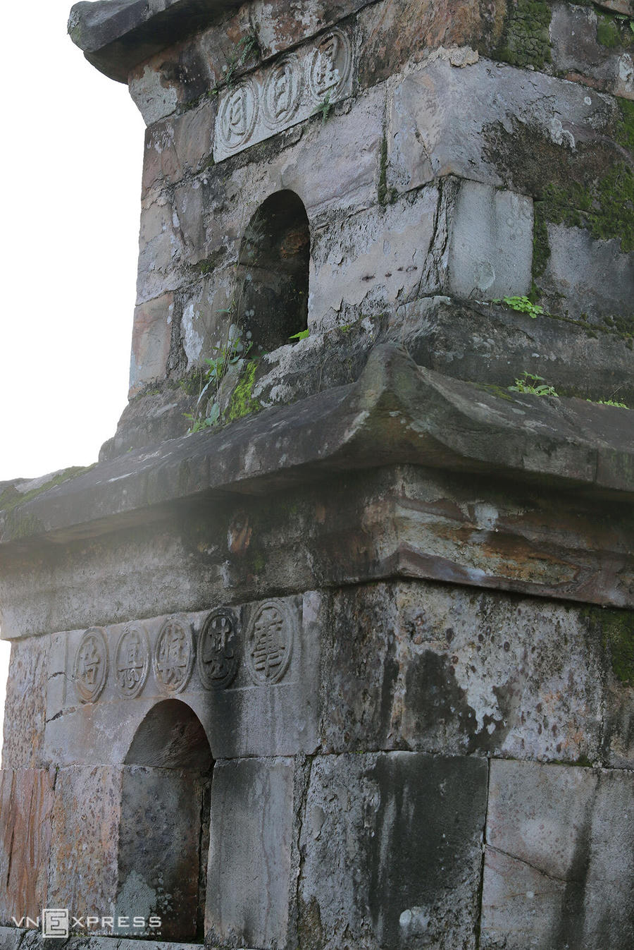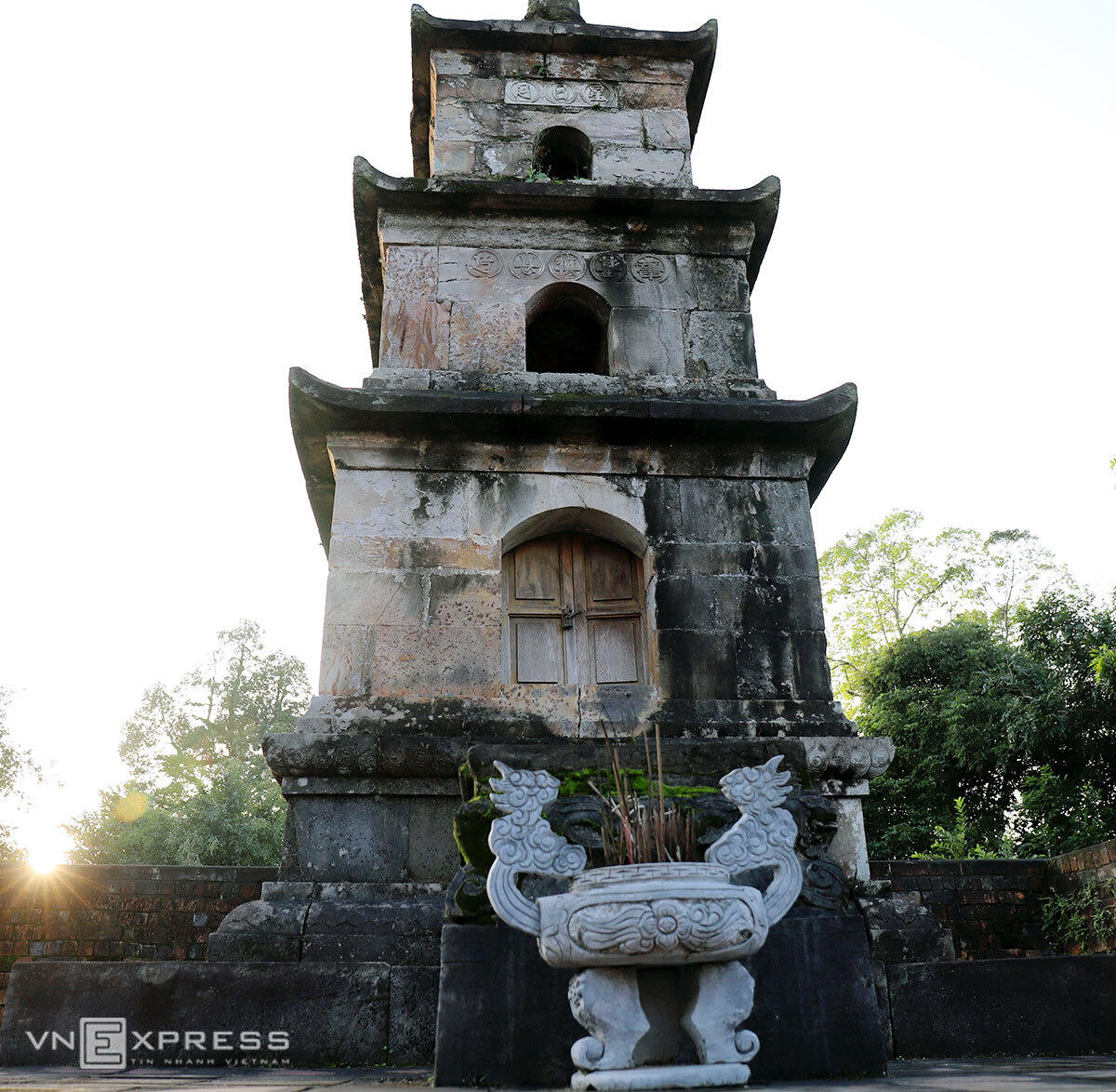 Tháp có cấu trúc hình đồ vuông, cao hơn 3 m, gồm 3 tầng (không kể bệ và chân), phía trước tháp đặt lư hương.