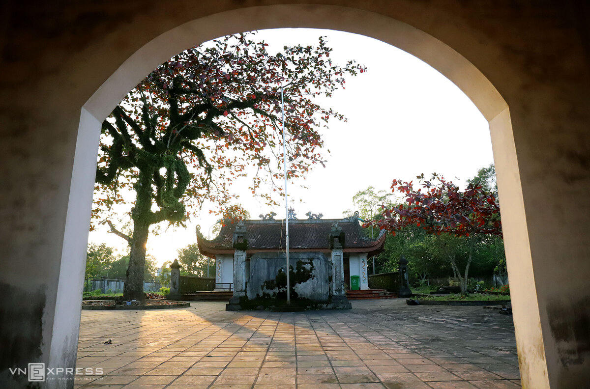 Phía sau điện thờ là cổng ra vào tháp đá với hai cánh cửa làm bằng gỗ ván.