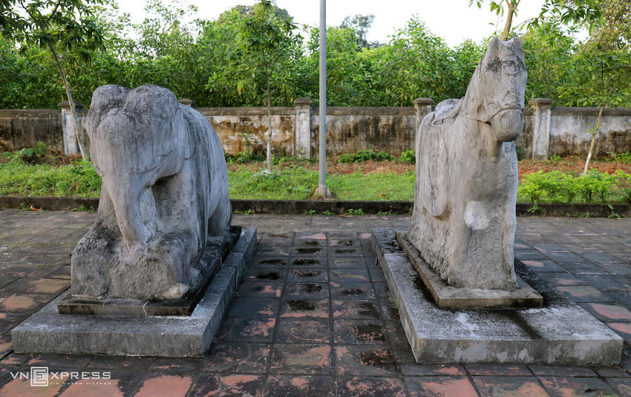 Trước cổng vào tháp đặt đăng đối hai bên hai cặp ngựa và voi tạc bằng đá.