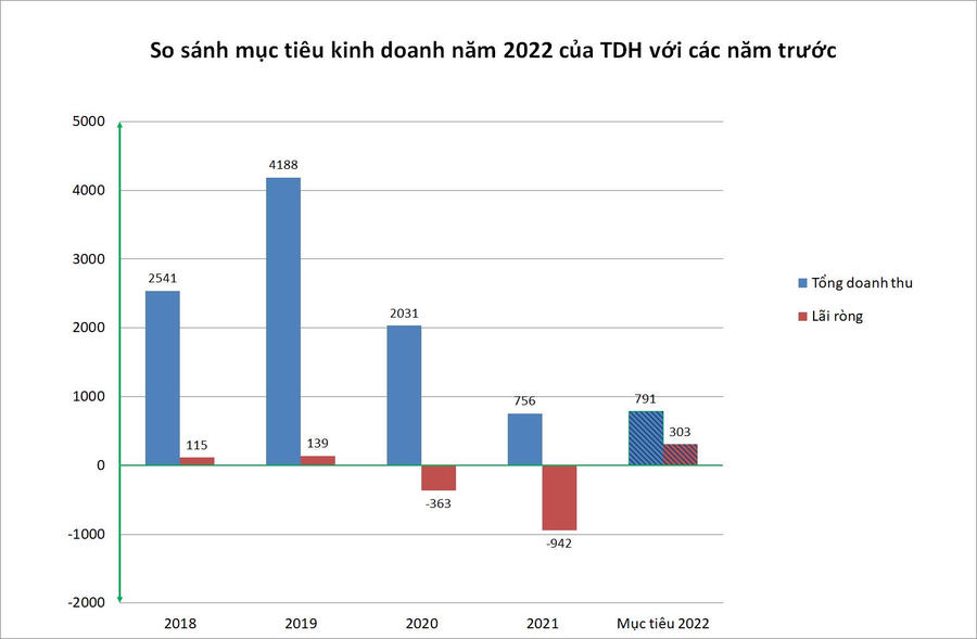 Về tổng thể, TDH đặt mục tiêu tổng doanh thu hợp nhất năm 2022 đạt hơn 791 tỷ đồng, tăng 4,7% so với năm 2021. Công ty kỳ vọng mang về lợi nhuận 303 tỷ đồng trong cùng kỳ. TDH dự kiến tiếp tục không chia cổ tức trong năm 2022.