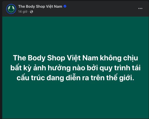 "The Body Shop Việt Nam không chịu bất kỳ ảnh hưởng nào bởi quy trình tái cấu trúc đang diễn ra trên thế giới" - là nội dung được đăng tải trên fanpage Facebook của The Body Shop Việt Nam.