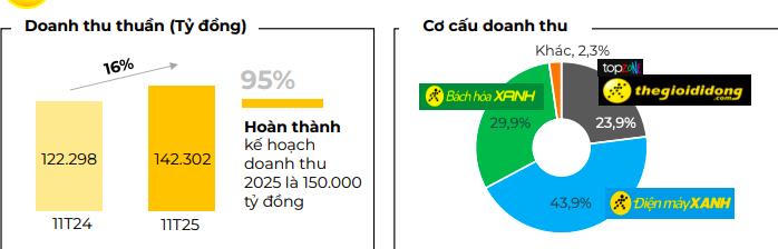 Về chuỗi siêu thị thực phẩm Bách Hóa Xanh, tính chung 11 tháng năm 2025, chuỗi Bách Hóa Xanh đạt gần 42.600 tỷ đồng doanh thu, tăng 14% so với cùng kỳ, với tăng trưởng đến từ cả hai nhóm thực phẩm tươisống và FMCG.