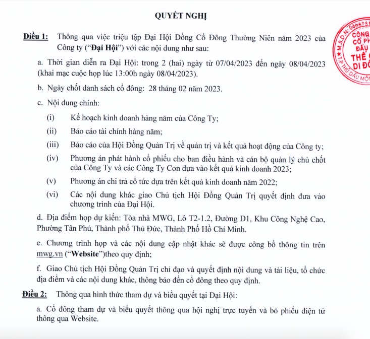 Ngày chốt danh sách cổ đông là ngày 28/2, tương đương ngày giao dịch không hưởng quyền là ngày 27/2. Thời gian dự kiến diễn ra đại hội của MWG là trong hai ngày 7 - 8/4. Địa điểm họp dự kiến là tại toà nhà MWG, Lô T2-1.2, đường D1, Khu công nghệ cao, phường Tân Phú, TP Thủ Đức, TP HCM.