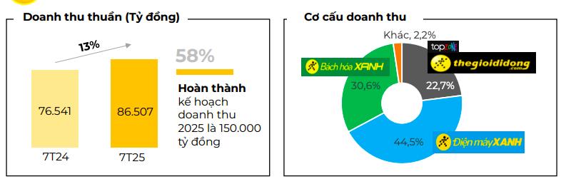 Trong đó, chuỗi Thế Giới Di Động và Điện Máy Xanh mang về khoảng 58.000 tỷ đồng, tăng 13% so với cùng kỳ dù hệ thống hoạt động ít hơn khoảng 180 cửa hàng so với mức trung bình 7 tháng đầu năm 2024.