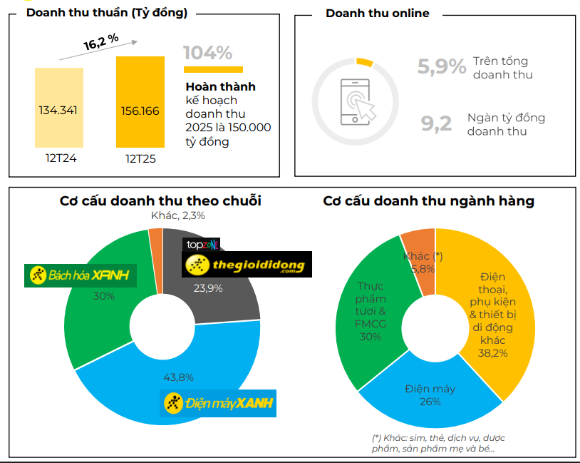 Hai chuỗi Thế Giới Di Động bao gồm Topzone và Điện Máy Xanh đóng góp doanh thu lần lượt 37.300 tỷ và 68.400 tỷ đồng, tương ứng mức tăng trưởng 18% so với năm 2024.