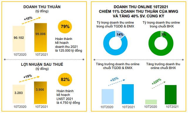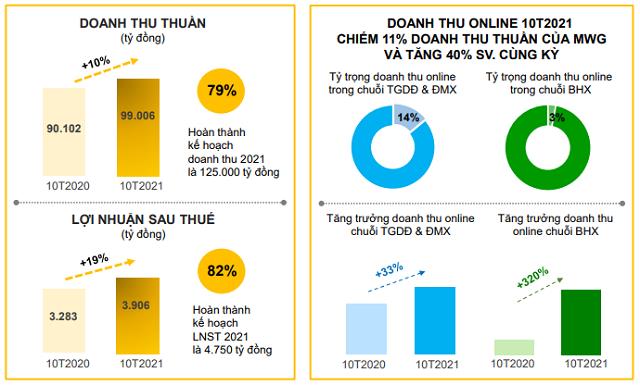 Lũy kế 10 tháng, MWG ghi nhận doanh thu hợp nhất 99.006 tỷ đồng, tăng 10% và thực hiện 79% kế hoạch năm; lợi nhuận sau thuế 3.906 tỷ đồng, tăng 19% và thực hiện 82% kế hoạch năm. Trong đó, chuỗi TGDĐ/ĐMX đóng góp 74.100 tỷ đồng, tăng 2%; BHX đóng góp 24.600 tỷ đồng, tăng 44%.