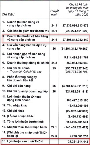 Trong kỳ, lợi nhuận gộp giảm 35,8% so với cùng kỳ, tương ứng giảm 2.909,8 tỷ đồng, về 5.214,5 tỷ đồng; doanh thu tài chính tăng 1,2%, tương ứng tăng thêm 4,2 tỷ đồng, lên 359,1 tỷ đồng; chi phí tài chính tăng 43,4%, tương ứng tăng thêm 89,5 tỷ đồng, lên 295,8 tỷ đồng; chi phí bán hàng và quản lý doanh nghiệp giảm 18,6%, tương ứng giảm 1.166 tỷ đồng, về 5.109,4 tỷ đồng và các hoạt động khác biến động không đáng kể.