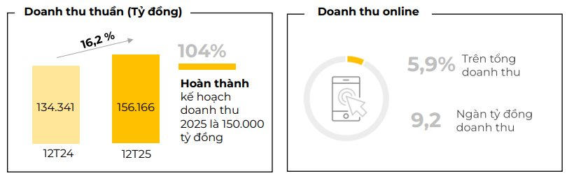 Nhìn lại năm tài chính 2025, Thế Giới Di Động đã ghi nhận kết quả kinh doanh ấn tượng với doanh thu cả năm đạt 156.166 tỷ đồng, tăng 16,2% so với năm 2024 và hoàn thành 104% kế hoạch. Trung bình mỗi ngày trong năm qua, doanh nghiệp ghi nhận doanh thu gần 428 tỷ đồng.