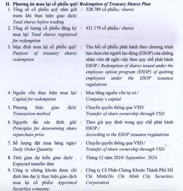 MWG thực hiện việc mua lại bằng nguồn vốn tự có, với giá mua được xác định theo nguyên tắc trong quy chế phát hành ESOP. Thời gian dự kiến giao dịch là trong tháng 12/2024.