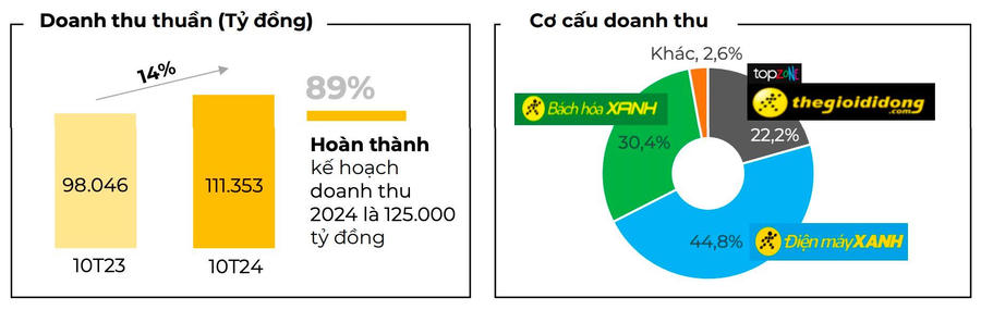 Về tình hình kinh doanh, luỹ kế 10 tháng đầu năm 2024, doanh thu MWG tăng trưởng 14% so với cùng kỳ và đã hoàn thành 89% kế hoạch cả năm. Trong đó, chuỗi Điện Máy Xanh đóng góp doanh thu lớn nhất với tỷ trọng 44,8% và nhóm Thế Giới Di Động và Topzone đóng góp 22,2% doanh thu.
