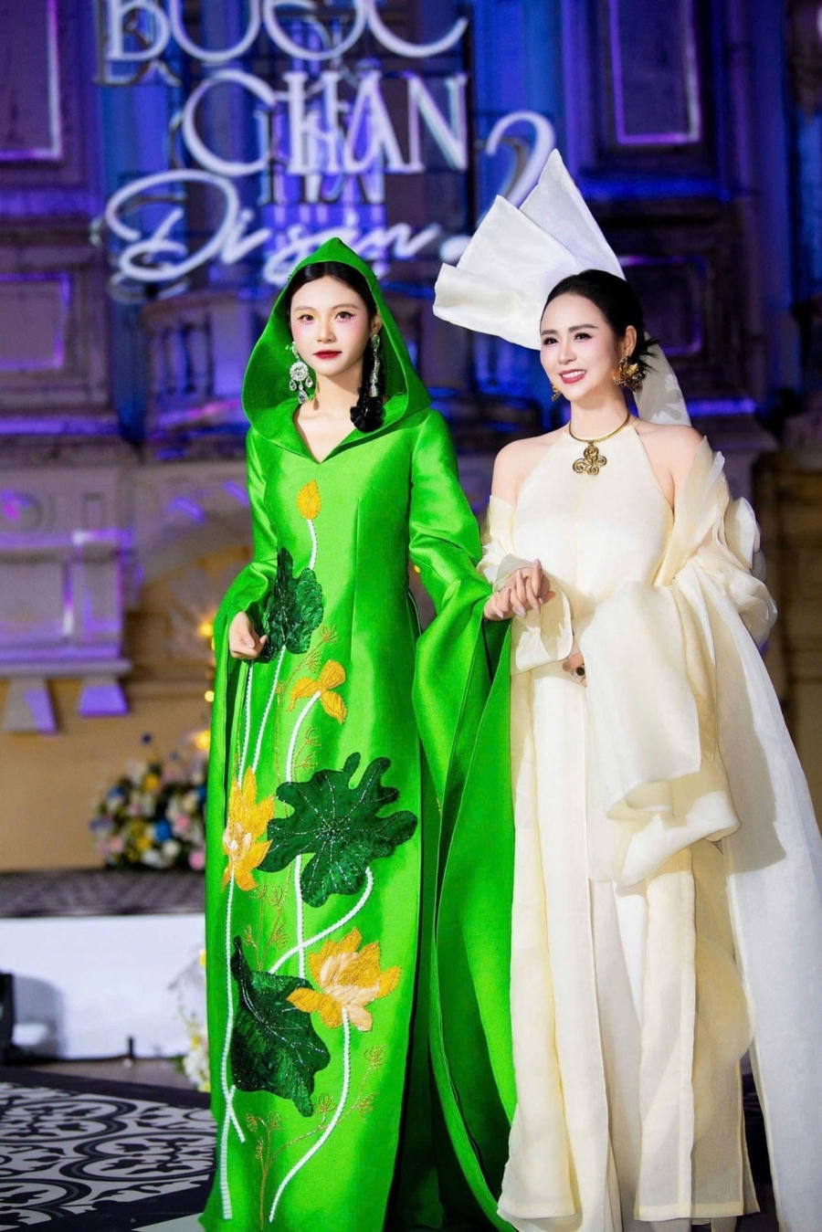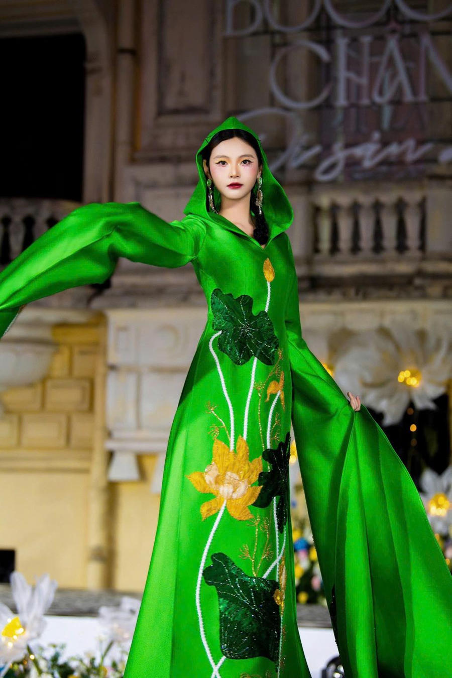 Show diễn có sự xuất hiện của Dương Hương Ly, con gái Bùi Thanh Hương. Nàng mẫu tự tin sải bước trong thiết kế áo dài xanh với điểm nhấn là họa tiết sen, thể hiện hình ảnh vừa nữ tính, vừa năng động.