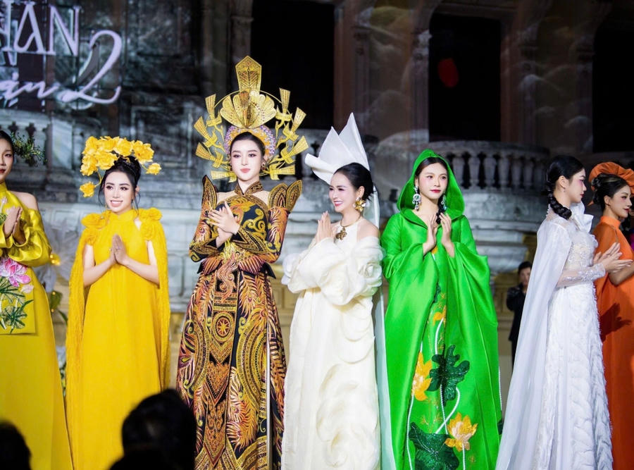 Bảng màu chủ đạo của 12 thiết kế này gồm đỏ huyết dụ, xanh rêu và vàng kim, gợi lên sự trang trọng. Bộ áo dài do Á hậu Huyền My trình diễn có nguồn cảm hứng từ mẹ Âu Cơ cầm chiếc đầu rồng phun lửa uy nghi.