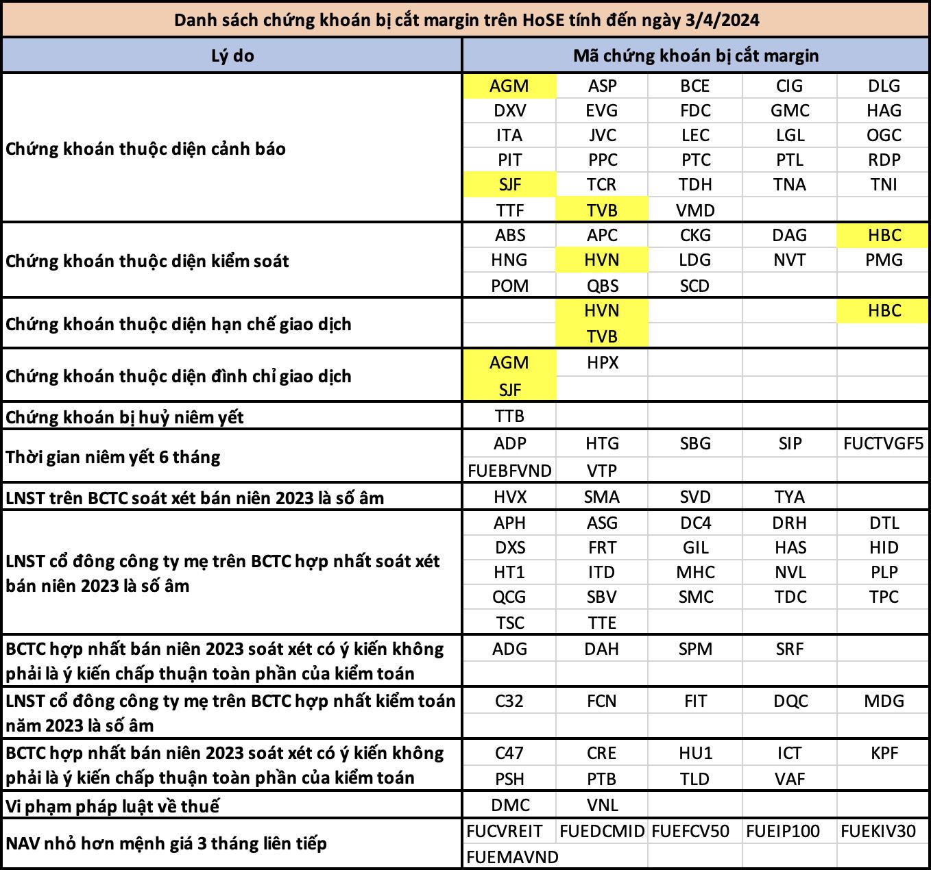 Tính đến hiện tại, tổng số lượng cổ phiếu không đủ điều kiện giao dịch ký quỹ lên đến 104 mã gồm nhiều cái tên quen thuộc như: HAG, HNG, HVN, HBC, NVL, POM, OGC, DLG… Các lý do chính dẫn đến tình trạng trên chủ yếu là: Lỗ kiểm toán bán niên 2023; BCTC bán niên 2023 có ý kiến của đơn vị kiểm toán; lỗ kiểm toán năm 2023; BCTC kiểm toán năm 2023 có ý kiến của đơn vị kiểm toán; chứng khoán thuộc diện bị cảnh báo/kiểm soát/hạn chế giao dịch/đình chỉ giao dịch/chứng khoán có khả năng bị hủy niêm yết; thời gian niêm yết dưới 6 tháng,...