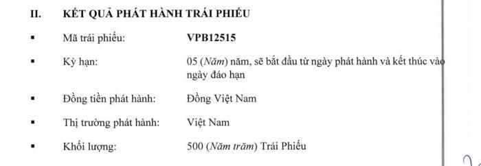 Ngày 3/12/2025, VPBank chào bán thành công 500 trái phiếu mã VPB12515 ra thị trường trong nước. Với mệnh giá 1 tỷ đồng/trái phiếu, lô trái phiếu có tổng giá trị phát hành 500 tỷ đồng.