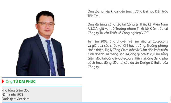 Ông Từ Đại Phúc sinh năm 1975, tốt nghiệp khoa Kiến trúc trường Đại học Kiến trúc TP HCM. Gia nhập Coteccons vào năm 2002, ông Phúc đã giữ qua nhiều chức vụ: Chỉ huy trưởng, Trưởng phòng Hoàn thiện, Trợ lý Tổng giám đốc và Giám đốc Phát triển Kinh doanh. Từ tháng 3/2014, ông giữ chức vụ Phó Tổng giám đốc tại Coteccons và phụ trách hoạt động đầu tư, các dự án Design & Build của công ty.