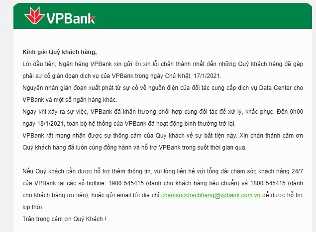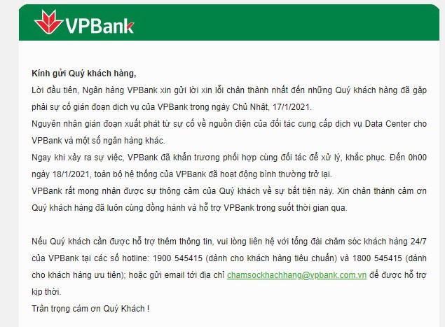 VPBank đồng thời gửi lời xin lỗi đến các khách hàng đã gặp phải sự cố gián đoạn dịch vụ của VPBank trong ngày Chủ Nhật, 17/1/2021.