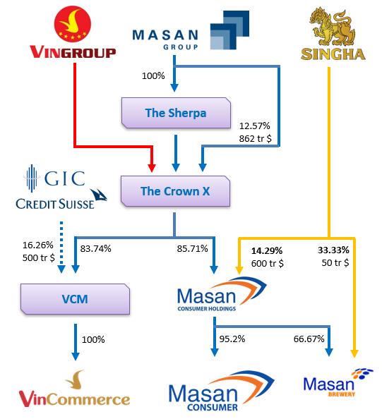 Theo như thỏa thuận giữa Vingroup và Masan, mới đây Masan đã tiến hành thành lập Công ty CrownX trực tiếp sở hữu phần vốn tại cả Vincommerce và Masan Consumer Holdings - công ty sở hữu toàn bộ mảng kinh doanh hàng tiêu dùng của Masan.