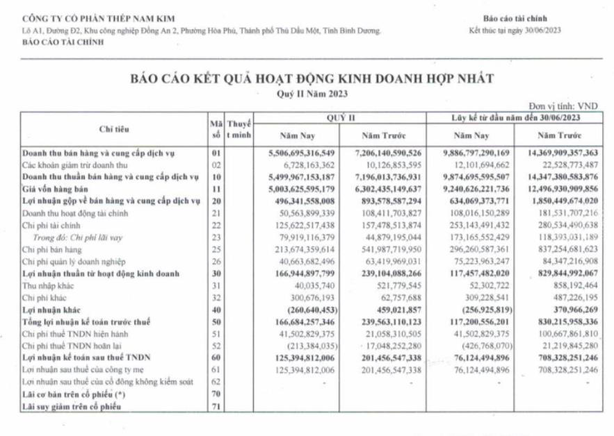 Luỹ kế 6 tháng đầu năm 2023, Nam Kim công bố doanh thu thuần đạt 9.874,6 tỷ đồng, giảm 31% so với cùng kỳ năm ngoái.