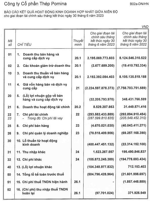 Công ty cổ phần Thép Pomina (mã ck: POM) mới đây công bố báo cáo tài chính bán niên năm 2023 sau soát xét với doanh thu thuần đạt 2.192 tỷ đồng, giảm 72,9% so với cùng kỳ và giảm 10% so với báo cáo tự lập.