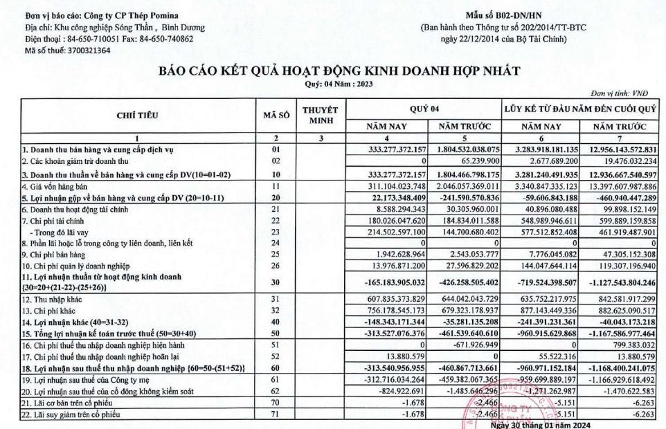Lũy kế cả năm 2023, Pomina đạt doanh thu thuần hơn 3.280 tỷ đồng, giảm 75% so với mức thực hiện của năm 2022. Công ty cũng báo lỗ sau thuế 960 tỷ đồng, giảm nhẹ so với mức lỗ 1.168 tỷ năm 2022, qua đó đánh dấu 2 năm lỗ liên tiếp.