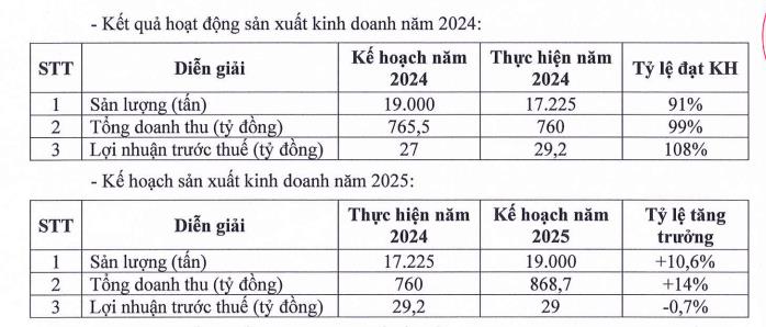 Dù vậy, bước sang năm 2025, công ty đặt mục tiêu kinh doanh với tổng doanh thu đạt 868,7 tỷ đồng, tăng 14% so với thực hiện năm ngoái. Lợi nhuận trước thuế giảm nhẹ 0,7%, đạt 29 tỷ đồng. Sản lượng công ty đề ra trong năm 2025 tăng trưởng 10,6%, đạt 19.000 tấn.