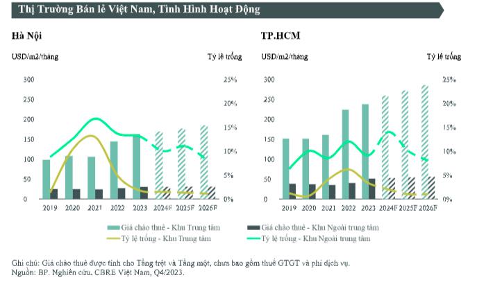Tại Hà Nội, giá thuê tầng trệt tại khu vực trung tâm ở mức 162 USD/m2/tháng, tăng 13% so với năm trước. Tại TP.HCM, giá thuê trung bình khu vực trung tâm gần ngưỡng 240 USD/m2/tháng, tăng 6% so với năm trước. Hầu như không có diện tích bán lẻ trống tại khu vực trung tâm ở cả hai thành phố.