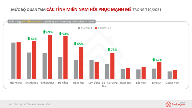 Nhìn chung, mức độ quan tâm thị trường bất động sản hồi phục mạnh mẽ trong tháng 10, Bình Dương tăng 69%; Đà Nẵng tăng 94%; Đồng Nai tăng 65%; Bà Riạ - Vũng Tàu tăng 73%; Long An 62%; Khánh Hoà 42%...