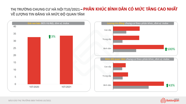 Riêng tại Hà Nội, mức độ quan tâm và lượng tin đăng đều tăng 22% so với cùng kỳ năm ngoái nhưng tăng mạnh lần lượt 48% và 108% so với tháng 9.