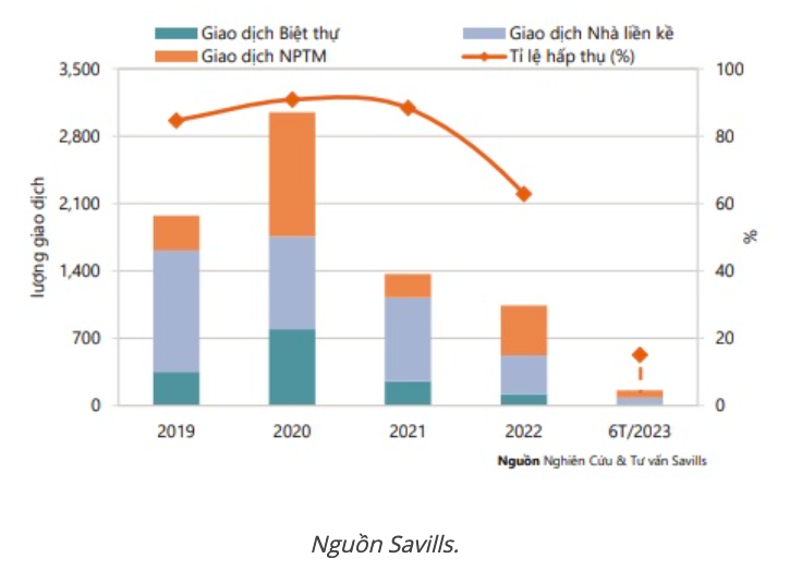 Tỷ lệ hấp thụ trong 6 tháng đầu năm 2023 đạt 17%, giảm 56% theo năm. Giá bán trung bình 125 triệu đồng/m2 thông thủy, tăng 44% theo năm do tồn kho hạng A và B giá cao.