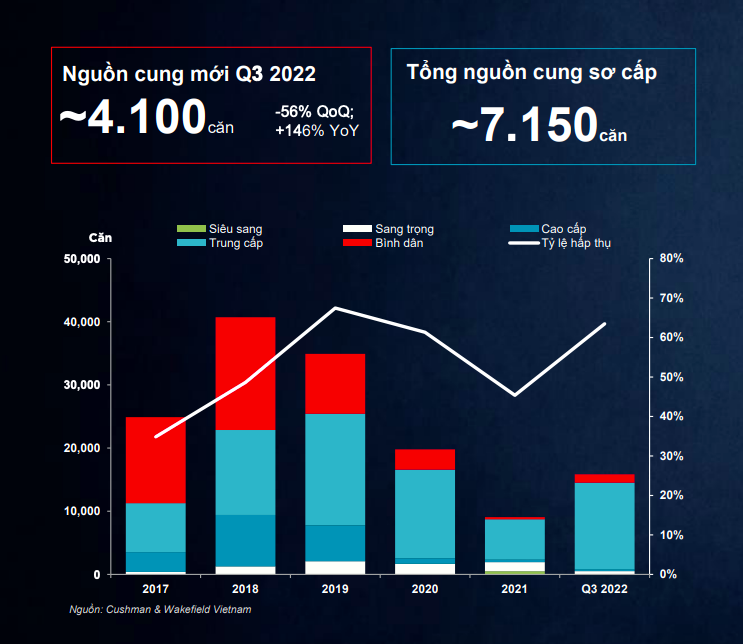 Theo báo cáo thị trường bất động sản tại TP HCM trong quý III/2022 của Cushman & Wakefield, lượng bán và tỷ lệ hấp thụ giảm mạnh, chỉ có khoảng 4.100 căn được giao dịch, giảm đến 54% so với quý trước.
