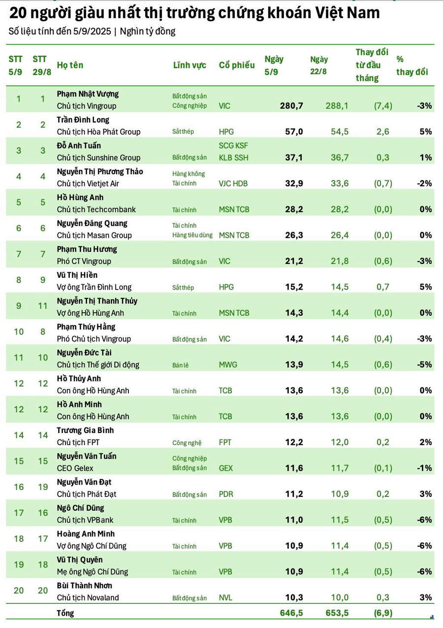 Tính đến ngày 5/9/2025, tổng tài sản của 20 người giàu nhất sàn chứng khoán Việt Nam đạt 646.500 tỷ đồng, giảm 6.900 tỷ đồng so với cuối tháng 8. Đa số tài sản của những người giàu trong top 20 đã "dậm chân tại chỗ" hoặc giảm nhẹ.