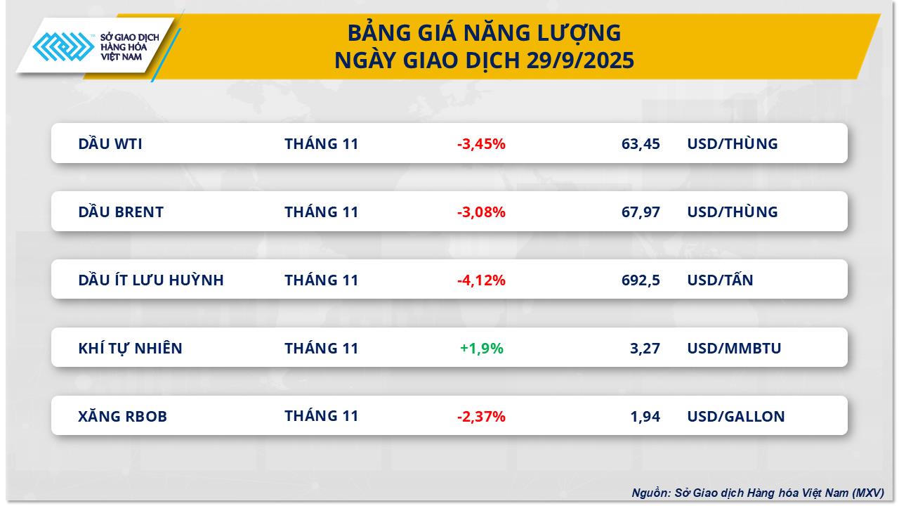 Theo Sở Giao dịch hàng hóa Việt Nam (MXV), thị trường năng lượng chìm trong sắc đỏ trong phiên giao dịch hôm qua, khi hầu hết các mặt hàng chủ chốt đồng loạt giảm mạnh. Giá dầu WTI mất gần 3,5%, lùi về 63,4 USD/thùng, trong khi dầu Brent cũng giảm hơn 3% xuống 67,9 USD/thùng. Những tín hiệu tích cực về nguồn cung xuất hiện cuối tuần qua đã chặn đứng chuỗi 4 phiên tăng liên tiếp trước đó.