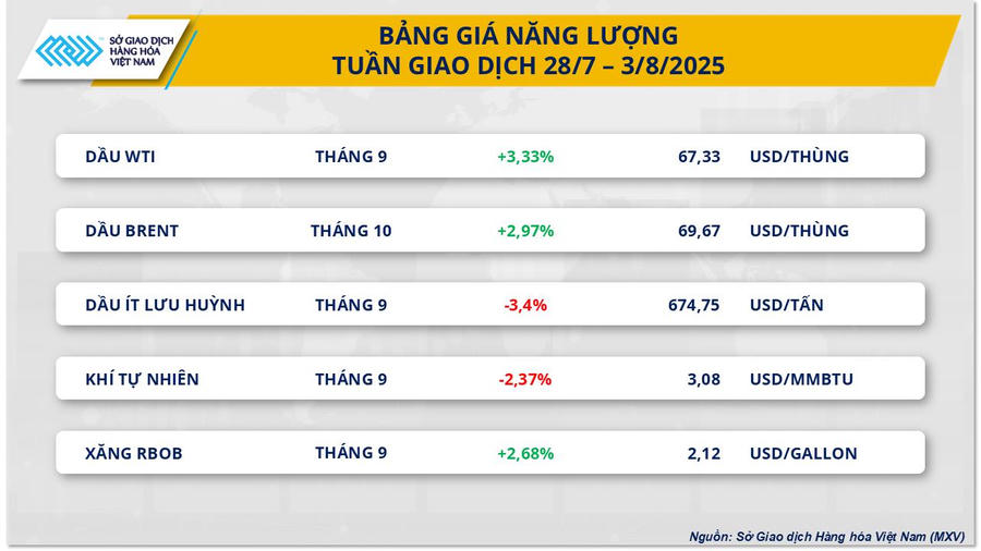 Trái ngược với xu hướng chung, việc Tổng thống Mỹ Donald Trump công bố thoả thuận được trông đợi nhất với Liên minh châu Âu (EU) lại hỗ trợ thị trường năng lượng ghi nhận những tín hiệu khởi sắc. Trong đó, giá dầu Brent dừng ở mốc 69,67 USD/thùng, tương ứng mức tăng tuần gần 3%, giá dầu WTI cũng ghi nhận mức tăng tới hơn 3%, lên mốc 67,3 USD/thùng.