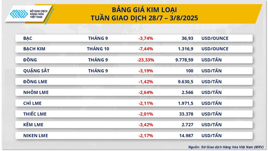 Khép lại tuần giao dịch từ 28/7-1/8, thị trường kim loại chìm sâu trong sắc đỏ trước những áp lực từ các chính sách thương mại và tiền tệ mới được công bố. Chốt phiên ngày 1/8, giá bạc giảm xuống còn 36,93 USD/ounce, tương ứng mức giảm 3,74% trong tuần, đồng thời cũng là tuần giảm mạnh nhất kể từ cuối tháng 3.