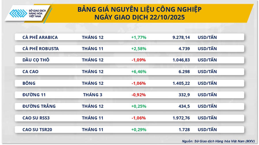 Phiên giao dịch hôm qua (22/10) chứng kiến sắc xanh phủ rộng trên thị trường hàng hóa nguyên liệu thế giới, đánh dấu nhịp hồi phục đáng chú ý sau chuỗi phiên đầy biến động. Theo Sở Giao dịch hàng hóa Việt Nam (MXV), chỉ số MXV-Index chốt phiên tăng 0,9%, lên mức 2.275 điểm. Nhóm nguyên liệu công nghiệp dẫn dắt đà tăng của toàn thị trường, nổi bật là giá ca cao bật gần 6,5% nhờ tín hiệu tích cực từ nhu cầu và nguồn cung.